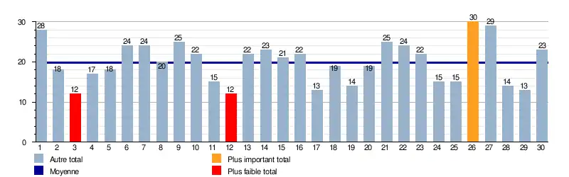 Ce graphique représente le nombre de buts marqués (598 au total cette saison) lors de chaque journée. Il est également indiqué la moyenne totale sur la saison, qui est de 19,93 buts par journée (soit 2,49 par match).