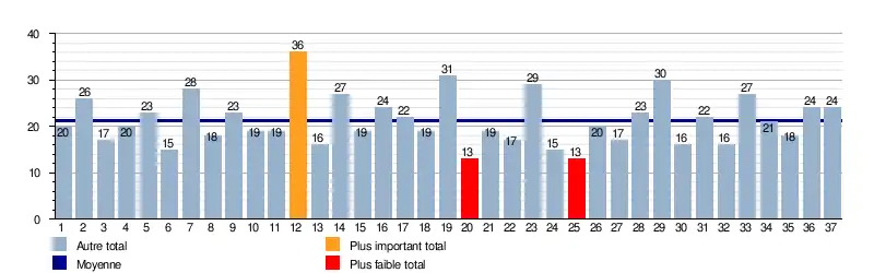 Ce graphique représente le nombre de buts marqués (786 au total cette saison[14]) lors de chaque journée. Il est également indiqué la moyenne totale sur la saison, qui est de 21,24 buts par journée (2,66 par match)[14], en nette augmentation par rapport à la saison précédente (la moyenne était alors de 19,93 buts par journée). Elle est également la plus haute depuis huit saisons[14].