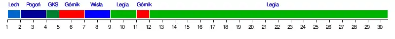 Ce dernier, premier lors de la majeure partie de la saison régulière, est finalement dépassé par le Lech Poznań en début de seconde phase et ne peut combler son retard. Le Lech obtient ainsi le septième championnat de son histoire.