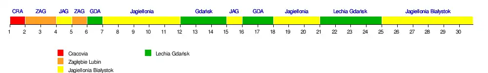 | Lechia Gdańsk | 2-1 | 1-2 | 4-2 | 3-0 | 3-0 | 3-2 | 2-1 | 1-2 | 3-2 | 1-1 | 2-1 | 3-0 | 3-1 | 2-1 | 1-0 | |