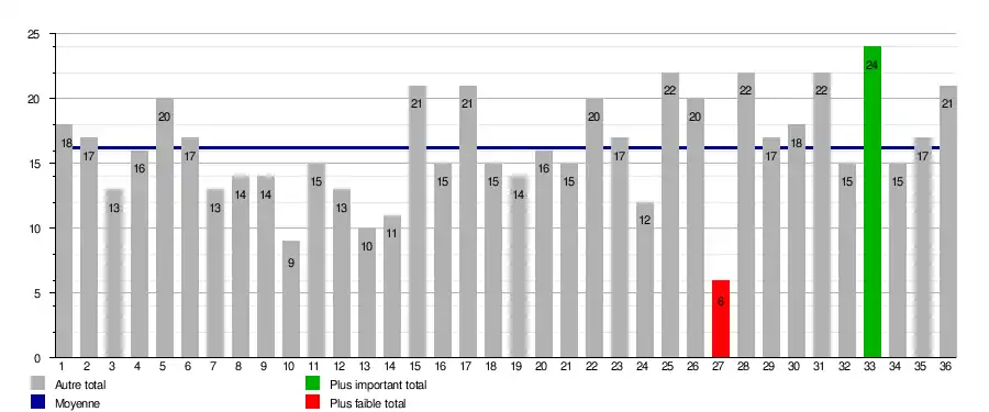 | Journée → | 1 | 2 | 3 | 4 | 5 | 6 | 7 | 8 | 9 | 10 | 11 | 12 | 13 | 14 | 15 | 16 | 17 | 18 | 19 | 20 | 21 | 22 | 23 | 24 | 25 | 26 | 27 | 28 | 29 | 30 | 31 | 32 | 33 | 34 | 35 | 36 | 1er | bar. | rel. |