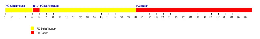 | Schaffhouse | 10 | 10 | 10 | 10 | 8 | 10 | 10 | 10 | 10 | 10 | 10 | 10 | 10 | 10 | 10 | 10-1 | 10-1 | 10-1 | 10-1 | 10-1 | 9 | 9 | 8 | 9 | 9 | 9 | 8 | 9 | 8 | 8 | 9 | 9 | 9 | 19 | |||||
