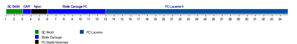 | FC Bâle II | 11 | 6 | 2 | 3 | 6 | 4 | 4 | 7 | 8 | 7 | 8 | 5 | 8 | 9 | 9 | 9 | 9 | 7 | 7 | 7 | 8 | 8 | 7 | 8 | 8 | 9 | 9 | 10 | 9 | 9 | 9 | 9 | 9 | 9 | ||||