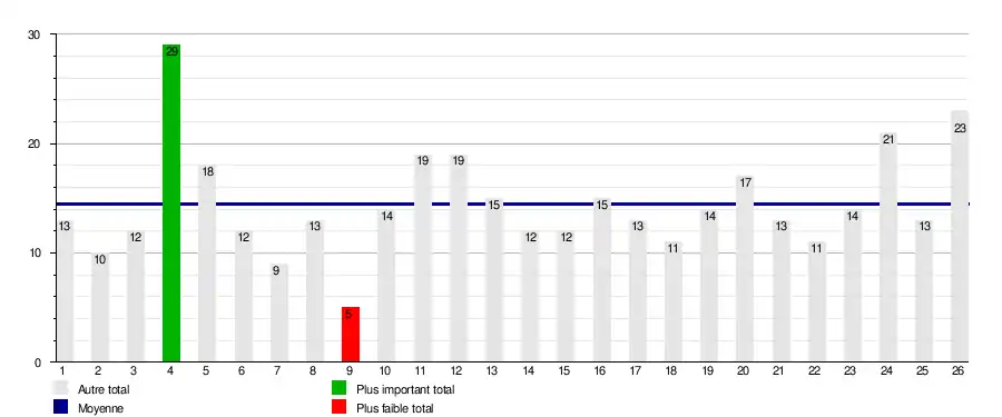 Ce graphique représente le nombre de buts marqués lors de chaque journée, pour un total de 377 buts en 26 journées (soit 14,50 par journée et 2,07 par match) :