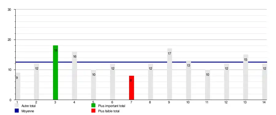 | Journée → | 1 | 2 | 3 | 4 | 5 | 6 | 7 | 8 | 9 | 10 | 11 | 12 | 13 | 14 | 1er | rel. |