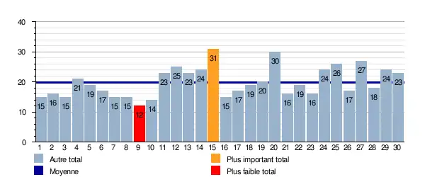 Ce graphique représente le nombre de buts marqués lors de chaque journée pour la zone centre. Il est également indiqué la moyenne total sur la saison qui est de 18,93 buts/journée.