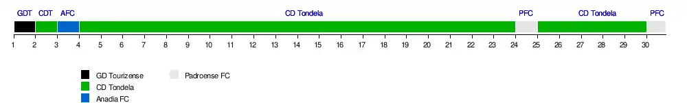 | Padroense FC | 9 | 13 | 11 | 9 | 3 | 2 | 2 | 4 | 3 | 4 | 3 | 3 | 3 | 3 | 3 | 3 | 3 | 2 | 3 | 2 | 2 | 2 | 2 | 1 | 3 | 3 | 3 | 3 | 3 | 1 |