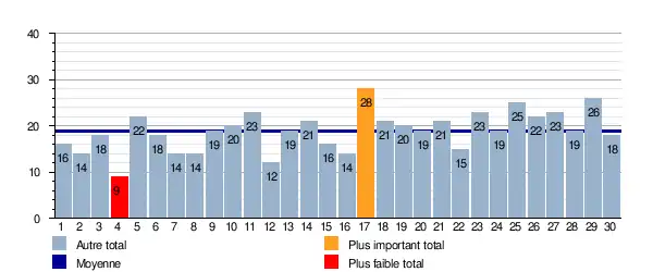 Ce graphique représente le nombre de buts marqués lors de chaque journée pour la zone sud. Il est également indiqué la moyenne total sur la saison qui est de 19,86 buts/journée.