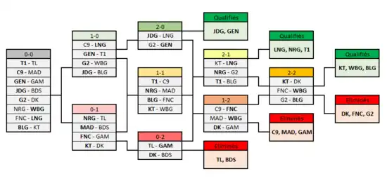 Dans le cas où une équipe est en 2-1 ou en 1-2, elle jouera un 4e round voire un 5e pour déterminer sa place, l'essentiel est qu'une équipe ait 3 victoires ou 3 défaites à la fin de la ronde pour déterminer sa qualification ou son élimination ; cela dit, seulement 8 équipes peuvent avancer en quarts de finale et pour cela, il nécessite d'atteindre ses 3 victoires.