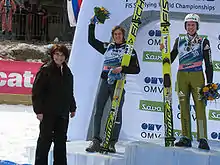 Simon Ammann (en haut du podium) et Gregor Schlierenzauer (sur la deuxième marche), podium présenté par Ljubica Jelušič, le ministre slovène de la défense.