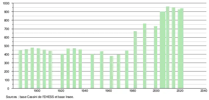 L'évolution du nombre d'habitants est connue à travers les recensements de la population effectués dans la commune depuis 1886. Pour les communes de moins de 10 000 habitants, une enquête de recensement portant sur toute la population est réalisée tous les cinq ans, les populations légales des années intermédiaires étant quant à elles estimées par interpolation ou extrapolation[16]. Pour la commune, le premier recensement exhaustif entrant dans le cadre du nouveau dispositif a été réalisé en 2004[17].
