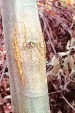Attaque du chancre sur un châtaignier américain (espèce la plus sensible). | |