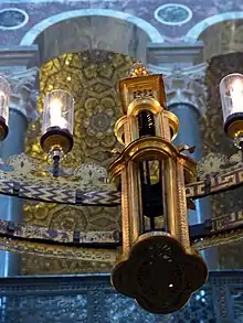 Le chandelier de Barberousse est en cuivre doré ; il a un diamètre de 4,16 mètres. Il est fixé au centre de la coupole octogonale au moyen d'une chaîne d'environ 27 mètres qui se termine dans une boule centrale. Les maillons de la chaîne diminuent du haut vers le bas d'une longueur de 150 mm vers 130 mm et d'une largeur de 74 mm vers 70 mm[1]. Cela donne l'impression, vu d'en bas, que la chaîne a la même épaisseur sur toute sa longueur.