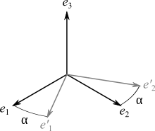 La nouvelle base B'(e'1, e'2, e'3) est obtenue par rotation d'un angle α autour de l'axe e3. On a ainsi :