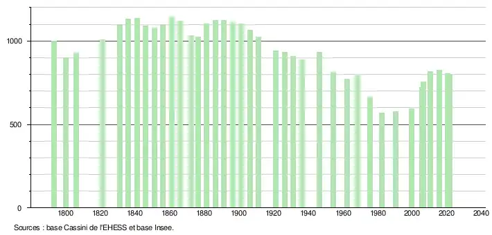 L'évolution du nombre d'habitants est connue à travers les recensements de la population effectués dans la commune depuis 1793. Pour les communes de moins de 10 000 habitants, une enquête de recensement portant sur toute la population est réalisée tous les cinq ans, les populations légales des années intermédiaires étant quant à elles estimées par interpolation ou extrapolation[25]. Pour la commune, le premier recensement exhaustif entrant dans le cadre du nouveau dispositif a été réalisé en 2005[26].
