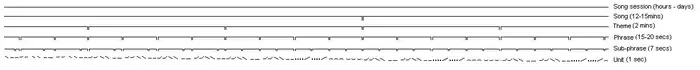 Une suite de 4 à 6 unités forme une sous-phrase, et dure environ 10 secondes. Au moins deux sous-phrases forment une phrase. Une baleine répète généralement une même phrase pendant 2 à 4 minutes, ce que l'on appelle un thème. Une suite de thèmes forme un chant. Les baleines peuvent répéter ce chant - qui dure environ 20 minutes - pendant des heures, voire des jours entiers. Cette hiérarchie linguistique en « poupées russes » a captivé l'attention des chercheurs.