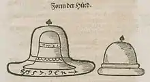 La forme du chapeau est variable. Quelquefois, spécialement dans le courant du XIIIe siècle, il ressemble à un bonnet phrygien mou, mais plus couramment, surtout au début, c'est un chapeau conique se terminant en pointe, avec à sa base un bord circulaire rond, apparemment rigide[14] ou en forme d'entonnoir renversé. On trouve aussi des versions plus petites, se fixant sur le sommet de la tête. Quelquefois, un anneau encercle le chapeau quelques centimètres au-dessus de la tête. Au XIVe siècle, une balle ou un pompon est fixé au sommet du chapeau, et le bout effilé devient alors une queue de diamètre constant[15]. Le sommet du chapeau devient plus plat ou rond (comme dans l'image du Codex Manesse).