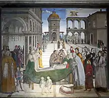 Au premier plan, le saint est allongé sur une civière qui, étant placée de côté, augmente la sensation de profondeur spatiale et fait mieux interagir les personnages avec l'espace environnant. Frères, pèlerins et gens du commun s'approchent pour rendre hommage au saint, tandis que sur les côtés se tiennent deux personnages contemporains richement vêtus dont le client lui-même à gauche, habillé d'un riche habit brodé d'or avec la cape fourrée et un gant chaussé, précédé d'un page qui porte une épée levée[12]. À côté de lui figurent d'autres membres de la famille[3].