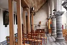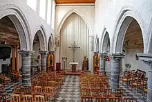De style intermédiaire entre le roman et le gothique, la partie la plus ancienne, datée de la première moitié du XIIIe siècle, est constituée de la nef et du chœur bâtis en pierre. La nef comprend deux rangées de cinq colonnes en pierre bleue de Tournai qui la séparent des collatéraux, les bas-côtés étant percés de deux séries de sept fenêtres. Le chœur est également séparé de la nef par un arc de pierre.