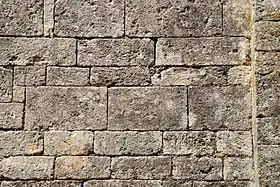La chapelle romane, à l'est, est un édifice de trois travées construit en pierre de taille assemblée en grand appareil, avec, par endroits, des traces d'opus monspelliensis (appareil alterné de Montpellier).
