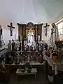 Dans une alcôve en pierre du chœur se dresse l'une des Bienheureuses Vierge Marie, vêtue et couronnée, avec l'Enfant Jésus, également couronné, sur son bras gauche.