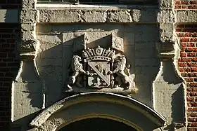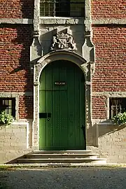 Le registre inférieur de la façade est composé de trois travées. La travée centrale est percée d'un portail dont les pilastres supportent un arc cintré flanqué de petites volutes et surmonté d'un larmier et du blason d'Hendrik van Dongelberghe[8],[10]. Chacune des deux travées latérales est percée d'une petite fenêtre rectangulaire placée très bas, juste au-dessus du soubassement en grès.