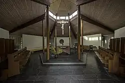 Les sculptures thématiques en pierre ont été réalisées par Helmut Lutz, tandis que les vitraux ont été conçus par Alfred Riedel (de). Le crucifix au-dessus de l'autel ainsi que la statue de la Vierge Marie ont été sculptés dans du bois. Un carré Sator est enchâssé dans le plancher[1].