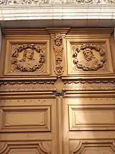 La partie centrale est encadrée de deux imposants pilastres dont le chapiteau ionique est orné d’une guirlande végétale ; ils portent un entablement à frise bombée ainsi qu’une corniche à modillons. Au-dessus, nous trouvons un fronton cintré de forme courbe. La porte centrale est de forme rectangulaire, de part et d’autre de cette porte, nous pouvons voir des pilastres ornés en partie supérieure de deux consoles. Entre ces pilastres, au-dessus du linteau, apparaissent des rinceaux en bas-relief. Les pilastres portent un fronton brisé dont les rampants sont légèrement incurvés et se terminent par des volutes. La base de ce fronton forme deux ressauts latéraux et est décorée de denticules. Au centre du fronton, dit « table » de par sa forme entourée d’un encadrement mouluré, nous pouvons lire l’inscription suivante « Saint Joseph », de part et d’autre d’un feuillage stylisé. Au-dessus du fronton, se place une niche voûtée en plein-cintre dont la partie supérieure est ornée d’une coquille abritant une statue aujourd’hui démontée. La niche est entourée sur ses côtés de pilastres décorés de têtes de chérubins et de chutes de fleurs. Entre l’extrados de l’arc de la niche et le sommet du fronton cartouche apparaît un décor végétal[2].