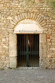 Elle est percée d'un portail, fermé d'une grille en fer, dont les piédroits constitués de gros blocs de pierre supportent un linteau en marbre blanc en remploi, surmonté d'un arc en plein cintre fait de moellons posés sur chant.