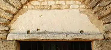 Ce linteau d'une longueur de 1,70 m présente un listel épais de 4 à 5 cm et deux trous arrondis disposés symétriquement par rapport au milieu[8]. Il fut enlevé au début du XXe siècle, utilisé comme ponceau pour accéder à une vigne et remis en place en 1965 lors de travaux de restauration[8].