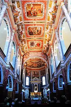 Sur les parties courbes de la voussure (la reliant aux piliers de soutien) sont peints les apôtres, avec guirlandes de fleurs. Les guirlandes, portées par des anges, sont toutes différentes. Dans les arcs supérieurs (de la tribune) sont représentés les grands saints de l’Église. Dans les arcs inférieurs : les saints jésuites.