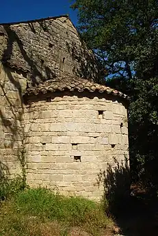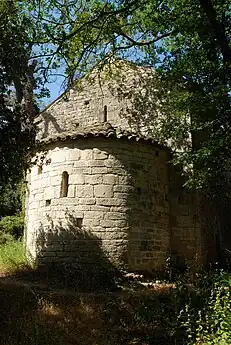 À l'est, l'église présente un chevet composé d'une abside semi-circulaire unique beaucoup plus basse que la nef. Cette abside, couverte de tuiles, est édifiée en pierre de taille disposée en appareil alterné (assises de pierres de taille minces et hautes, posées alternativement à plat et sur champ). Flanquée de contreforts en pierre de taille, elle est percée d'une fenêtre axiale à arc monolithe, alignée avec une fenêtre similaire percée dans le pignon oriental.