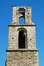 Les niveaux supérieurs du clocher, réalisés en pierre de taille assemblée en grand appareil (sauf réfections), sont percés sur chaque face[2] d'une fenêtre en plein cintre à double archivolte, dont les piédroits sont couronnés d'impostes en saillie.