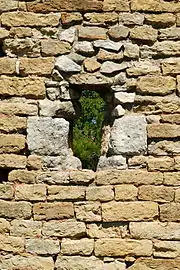 Le niveau inférieur est édifié en moellons et présente un chaînage d'angle en pierre au sud-est. Il est percé d'une petite fenêtre aux piédroits harpés et au linteau monolithe ainsi que de trous de boulin (trous destinés à ancrer les échafaudages).