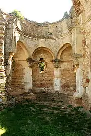L'intérieur, en ruines et sans dallage, conserve les restes d'une belle abside comportant trois absidioles logées dans l'épaisseur du mur[2].