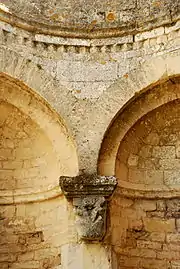 Les arcs d'ouverture des absidioles retombent sur des chapiteaux sculptés qui couronnaient des colonnes dont il ne reste que les bases[2].