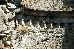 L'abside elle-même est également couverte d'une voûte en cul-de-four, partiellement effondrée. Cette voûte prend appui sur une corniche moulurée soulignée d'une frise de dents d'engrenage.