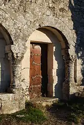 Ces arcades, avec les bases de colonne isolées en avant de la façade, constituent peut-être les vestiges d’un porche disparu[réf. nécessaire] ou d’un cloître[5]. La base de la façade est constituée d’un mur-bahut portant deux colonnettes courtes et épaisses qui supportent les vestiges de trois arcades. Seule l’arcade centrale est complète ; l’arcade de gauche n’est qu’à moitié complète et celle de droite se réduit à un seul claveau.