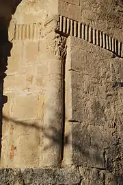 Le chevet est percé de trois fenêtres dont la plus importante présente une très intéressante décoration. Cette fenêtre est constituée d'une ouverture très étroite placée au fond d'une loge en pierre de taille encadrée de deux colonnettes monolithes assez primitives et très différentes l'une de l'autre, qui constituent certainement un remploi[3] d'époque antérieure. Les chapiteaux de ces colonnettes sont surmontés d'une frise de dents d'engrenage qui se prolonge tant à l'intérieur de la loge qu'à l'extérieur de celle-ci.