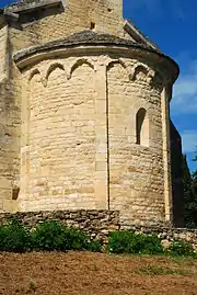 Cette abside semi-circulaire, édifiée en pierre de taille assemblée en appareil irrégulier, présente une décoration de bandes lombardes composées de lésènes et d'arcades groupées par trois.