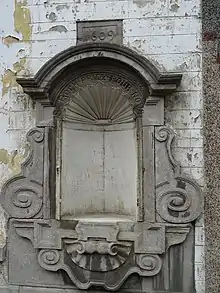 Au-dessus de cette inscription, un relief représente ces deux personnes en prière de part et d’autre d’un Christ en croix. Cette œuvre en pierre est encadrée par deux pilastres ioniques sur lesquels figurent huit blasons. Ces pilastres soutiennent un fronton circulaire orné d’un blason avec une couronne de laurier.