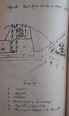 L’épidémie de peste jugulée, le cimetière reçoit des aménagements. Une église dédiée à saint Roch, saint invoqué contre la peste, le choléra et autres maladies contagieuses, est édifiée en 1591. Et en 1670, un grand calvaire en pierre est placé dans la perspective de l’entrée du champ de sépultures. Ces deux constructions apparaissent dans un plan urbain du XVIIIe siècle qui est reproduit dans l’ouvrage sur la paroisse de Braine-le-Comte (voir l’image ci-dessus). Cependant, elles subissent au cours du XIXe siècle des évolutions différentes. L’état de l’église se détériore au point d’obliger le clergé à l’abandonner au profit de l’église paroissiale Saint-Géry[1]. Quasiment en état ruine, sa démolition est finalement décidée en 1865. Cependant, le calvaire fut déplacé à la fin du XIXe siècle dans le cimetière actuel de la ville de Braine-le-Comte. Il orne toujours le sommet de l’ossuaire.