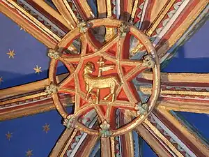 Au point de jonction des nervures dans chaque travée on voit des écussons et des fleurons d'une grande richesse, ainsi que des représentations d'anges et d'humains.