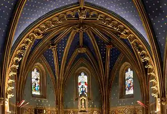 La voûte de la chapelle est divisée en cinq travées. Des arcs d'ogive en plein-cintre brisé délimitent ces travées. Le chœur et la partie de la nef à l'entrée (travée IV) ont des voûtes à croisée d'ogive qui sont complétées de liernes et tiercerons. Dans le chœur il y a six segments et cinq dans la travée IV.