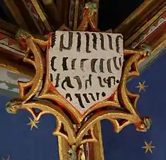 - Chœur : La clef de voûte est un écu aux armes de France, avec fleurs de lis dorées sur fond d'azur. Un fleuron en forme d'écusson à droite montre un bâton en barre accompagné d'un croissant en chef et d'une étoile en pointe. Chacun des quatre autres fleurons a un thème végétal.