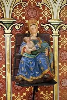 La Vierge est vêtue d'un costume rappelant le commencement du XVIe siècle et coiffée d'un diadème orné de festons et de pierreries simulées ; elle a la chevelure pendante ; de chaque côté de sa coiffure tombent des barbes ou bandeaux. Un manteau bleu à larges rebords est orné de croix rayonnantes. Elle tient sur ses genoux l'Enfant Jésus qui porte dans ses mains la boule du monde, ce dernier est à moitié enveloppé d'un manteau vert. La chaise ou trône sur lequel est assise la Vierge est orné de moulures et peint couleur marron.
