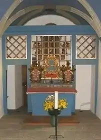 Sur une stèle près de l'autel, on peut lire en allemand : « Plus pour vous que pour moi (en français dans le texte), derrière cet autel repose, désormais, en Dieu, la Paix, le cœur de sa majesté l'impératrice et reine Zita, princesse de Bourbon-Parme, née à Pianore le , heureuse dans le Seigneur, décédée le , réunie, après 67 ans de séparation avec le cœur de son époux le , décédé sur l'île de Madère, l'empereur Charles Ier d'Autriche, roi apostolique de Hongrie, roi de Bohême, de Croatie, de Galicie, de la Dalmatie, etc., etc. »[13]. Sur les murs de la chapelle se trouvent d'autres inscriptions gravées dont la liste des noms de membres défunts de la famille.