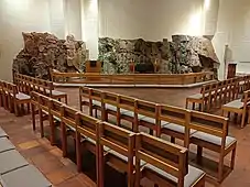 Les murs intérieurs de la chapelle sont blancs et maçonnés de manière que les jointures forment des lignes verticales et horizontales uniformes. Une grande partie de la partie inférieure du mur de l'autel est constituée de roche nue.