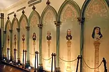On voit sur les murs de la chapelle quatorze arcs brisés, toujours sur une inspiration gothique, avec les portraits peints à l'huile, sur toile, des treize grands hommes correspondant aux treize mois du calendrier positiviste établi par Auguste Comte[12]. Un quatorzième arc est dédié au jour des femmes avec une représentation d'Héloïse. Cette dernière représente la « supériorité morale de la femme » chère à Comte.
