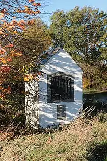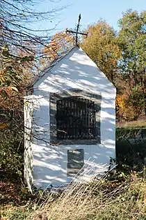 Abritée sous les arbres, la chapelle est un petit édifice enduit de crépi[1] peint en blanc.